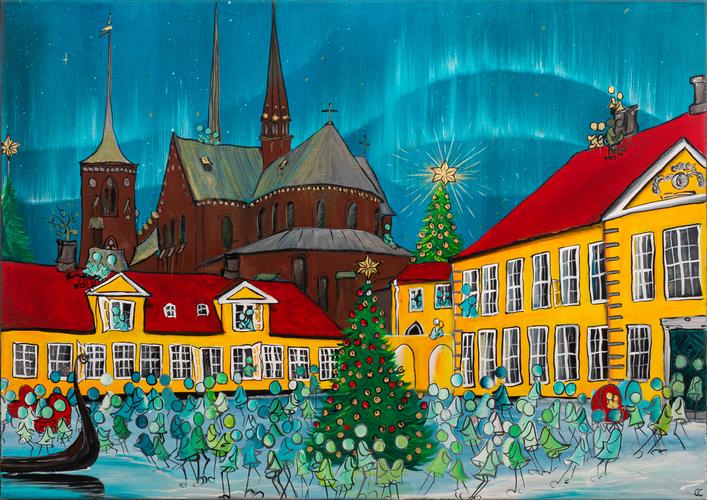 Til Roskilde har jeg ønsket at indfange både byens sjæl og den særlige stemning, der opstår, når julen rykker tættere på. Derfor finder du ikke kun ét, men flere juletræer i maleriet. Jeg har malet den stemningsfulde juletræstænding i Palægården, og naturligvis kan …