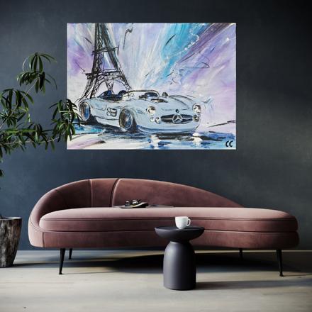 Maleriet fanger øjeblikket, hvor elegance møder hastighed. En elegant dæmpet blå Mercedes-Benz accelererer forbi det ikoniske Eiffeltårn, en unik kombination af stil og hastighed i kærlighedens by Paris.